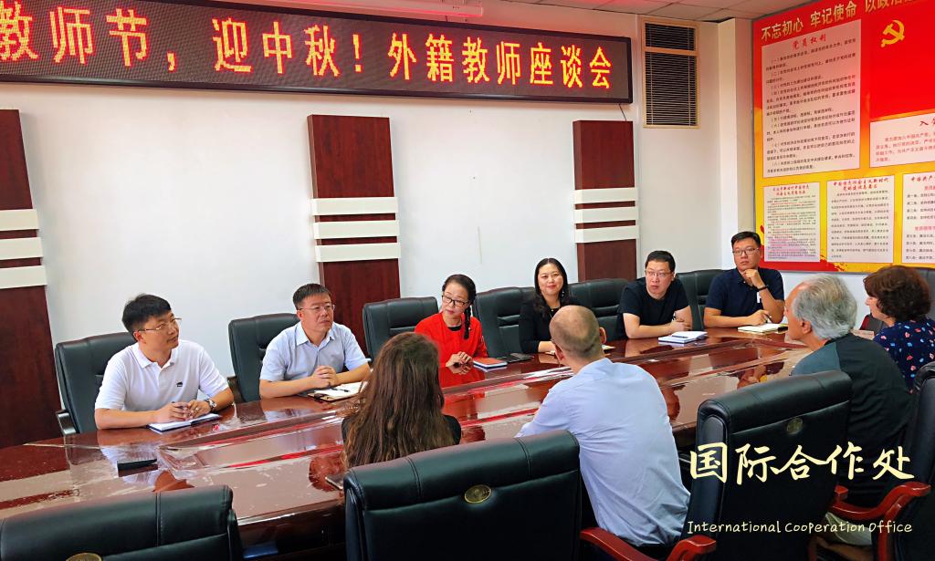 会上,国际合作交流处处长母丽华代表学校对外籍教师来华体(中国)工作表示感谢,并在教师节和中秋节到来之际,对外籍教师表达节日的祝福。在座谈会上,母处长强调外籍教师应 “遵守我国法律法规,自觉规范言行,要把握教师这个职业的特殊性,不但要在教育教学上有所要求,更要在课堂上对学生有正确的引导”。