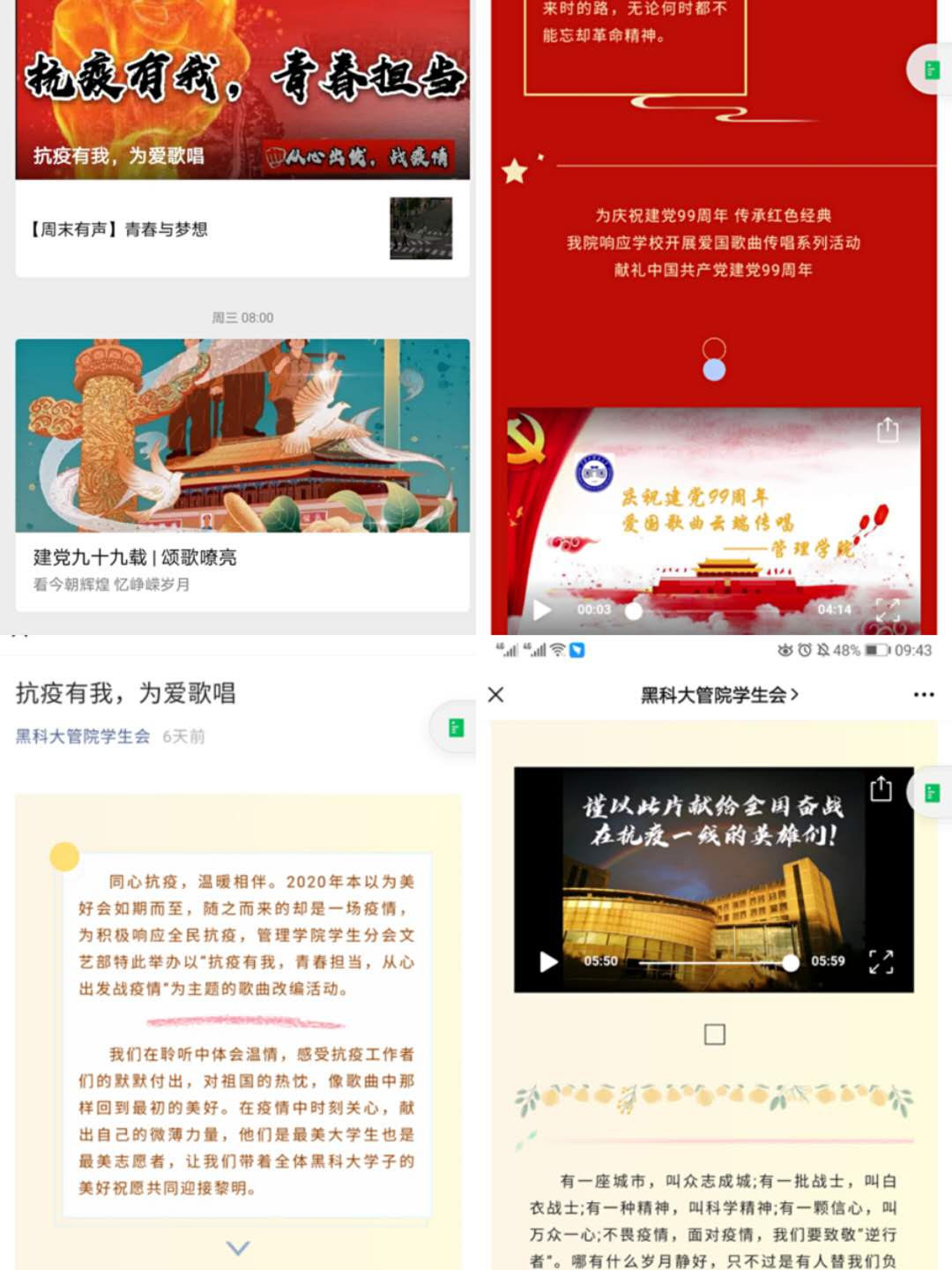 为热烈庆祝中国共产党成立九十九周年并持续深入学习贯彻习近平总书记有关疫情防控的重要指示精神,进一步巩固“不忘初心,牢记使命”爱国主题教育成果,教育引导青年党员、团员学党史、知党情、感党恩、跟党走并厚植其家国情怀,凝聚党支部与团支部战斗营垒共识合力,传承红色经典,管理学院于6月28日至7月1日开展“红心向党,抗疫高歌”云端爱国歌曲传唱系列活动。