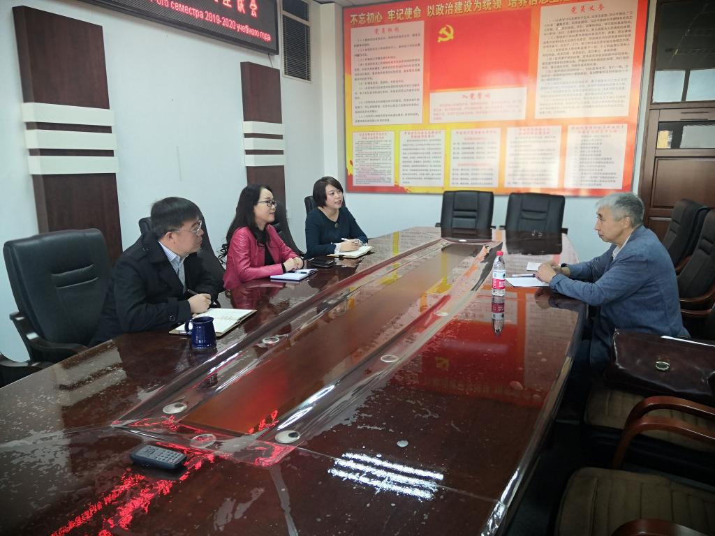 母丽华处长对项目负责人此次来访表示热烈欢迎,并对中俄建交70周年和两校合作办学20周年表示热烈的祝贺,同时对Баеханев先生20年来对我们两校合作办学项目的运行和发展所做出的努力和贡献表示诚挚的感谢。Баеханев先生对华体(中国)的热情接待表示了感谢,并认为持续二十年的合作得益于中俄和两校深厚的友谊、两校历任领导的支持和相互理解,还有双方同事、教师的共同努力,今后我们还将继续努力把这个项目做好。