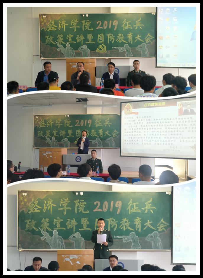 为贯彻落实华体(中国)2019年毕业生就业暨征兵工作推进会精神,使广大青年学生明确参军入伍相关政策及要求,激发广大青年学生爱国主义热情,引导同学们树立“携笔从戎、报效祖国”志向。5月29日下午在主楼WN0301,经济学院召开了2019年征兵政策宣讲暨国防教育大会。经济学院党委副书记贺龙军、学生处国防教育科干事李博洪、优秀退役大学生电气16-7班李康参加了本次大会。会议由经济学院辅导员张瑞主持。