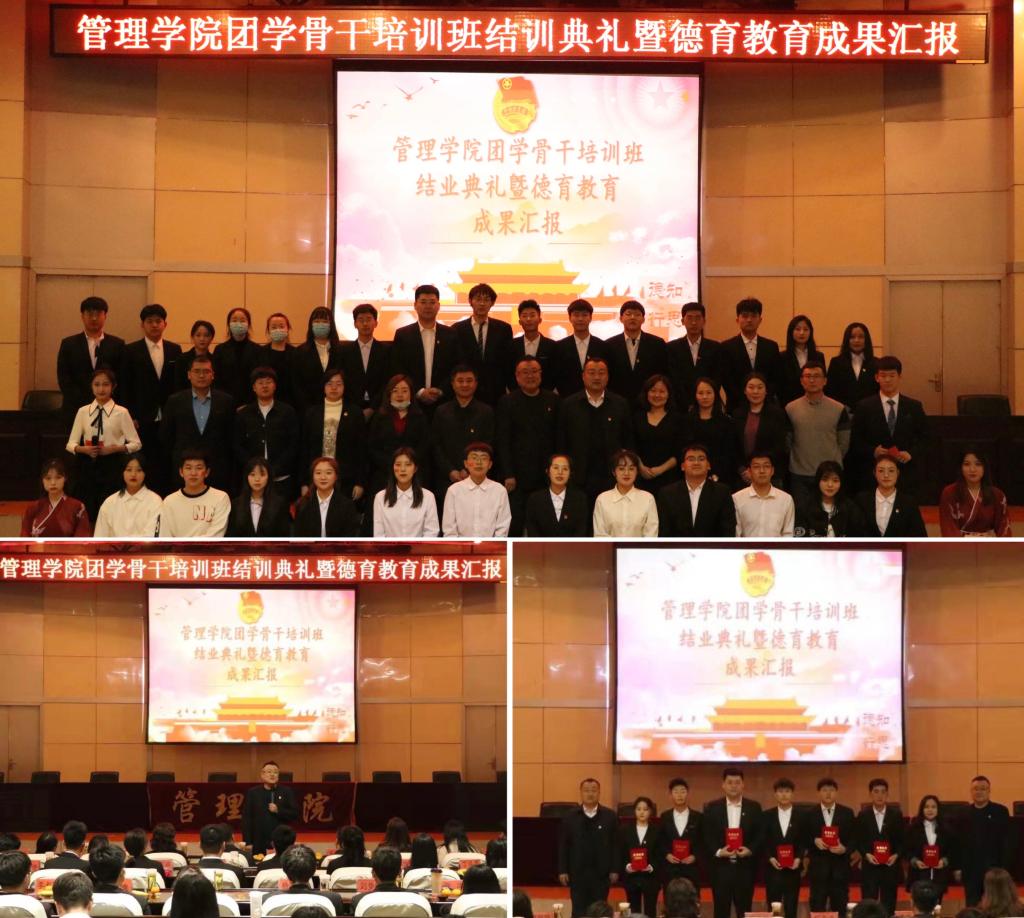管理学院于4月13日在信息报告大厅召开了团学骨干培训班结训典礼暨德育教育成果汇报会,管理学院党委书记何景洋、校团委书记宋玉彬、管理学院党委副书记张晓光、全体辅导员以及200余名团学干部共同参加了本次活动。