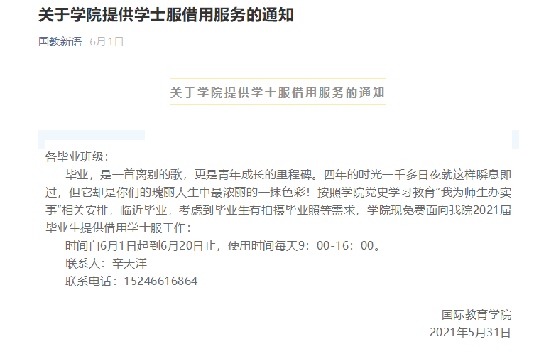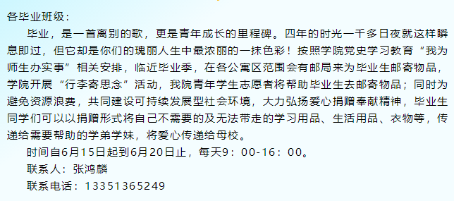 一次关怀服务。 坚持围绕学生、关照学生、服务学生,陆续开展了“借用学士服”、“行李寄相思”等活动,在关心、帮助、服务毕业生中引导毕业生感恩母校教育、铭记师生情,并号召毕业生将学习、生活等闲置物品捐赠给学弟学妹,进一步抒发毕业生们情系母校、心系学弟学妹的真挚情感,大力弘扬爱心捐赠奉献精神,培育了感恩意识。