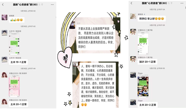 学院以“5.25”心理健康活动月为契机,结合学生工作实际,开展形式多样的大学生心理健康教育活动,丰富校园文化生活、陶冶学生情操的同时,依托网络教育阵地,将生命教育、感恩教育、思政教育与心理健康教育相结合,广泛宣传心理健康知识,倡导健康生活方式,提高心理保健能力,多角度锤炼学生心理素质,多途径提升心理调适能力,努力营造自助互助的浓厚氛围,让学生感到真情就在身边、温暖时刻同行,让心理健康教育“润物细无声”。