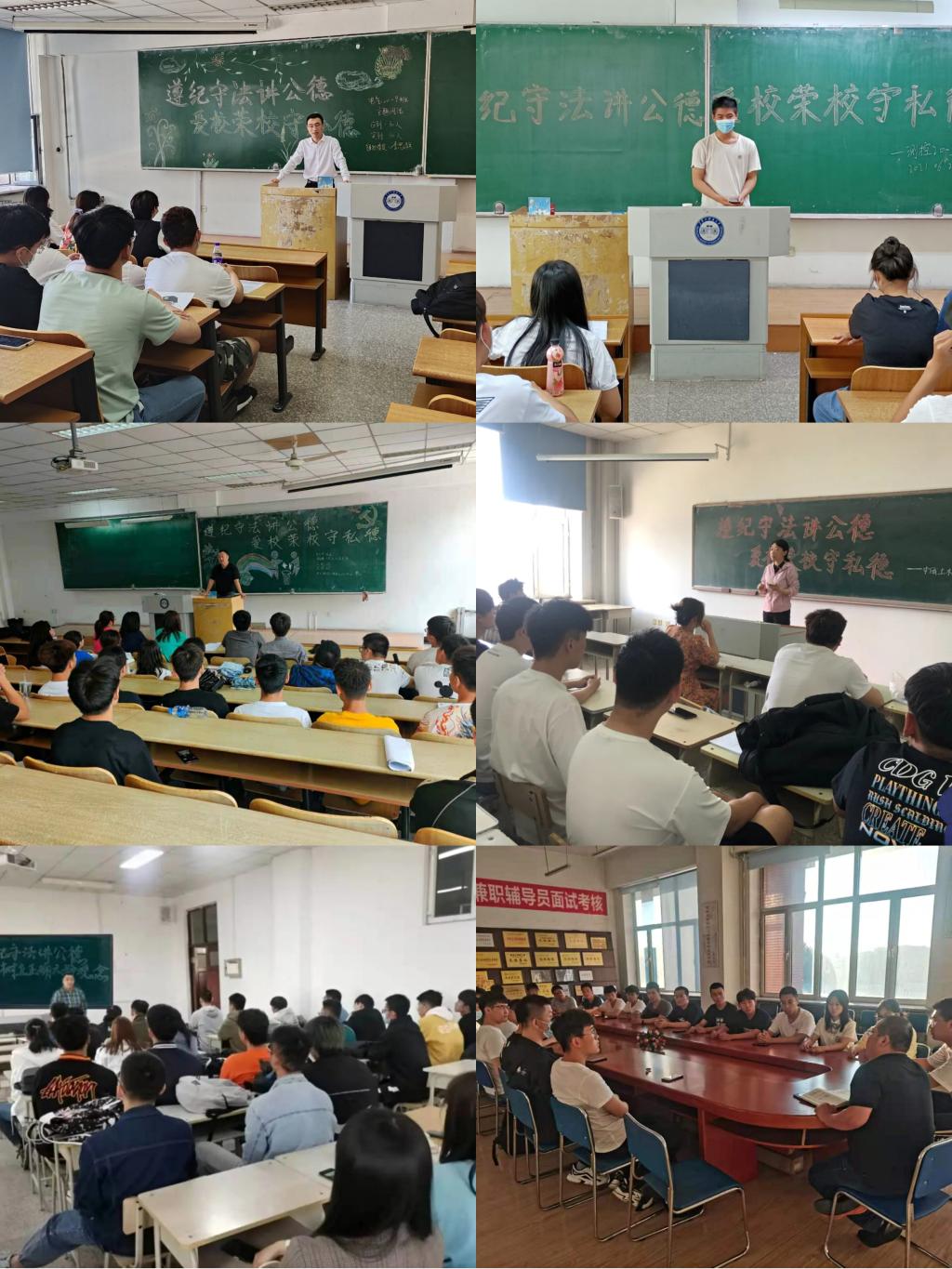 全校817个班级以“遵纪守法讲公德、爱校荣校守私德”为主题,围绕“看一看自己在思想认识、爱党爱国等方面与一名堪当大任的时代新人标准有多少差距,论一论大学生应该树立什么样的政治观;看一看当前大学生在着装、发型及人际交往中的不文明现象有哪些?论一论大学生应该树立什么样的文明观和道德观;对照《民法典》和学校校规校纪,看一看当前大学生中存在的违法违纪行为有哪些?论一论大学生应该树立什么样的法纪观;看一看自己与优秀同学之间的学习差距有多少?论一论学生应该树立什么样的学习观。各班级在组织全体青年学生研讨的基础上形成了研讨结论,达成了思想共识,并向全体同学发出“遵纪守法讲公德、爱校荣校守私德”的倡议。同时,全校毕业生班级在开展主题研讨时,还围绕如何高雅拍摄毕业照等内容开展了主题研讨。
