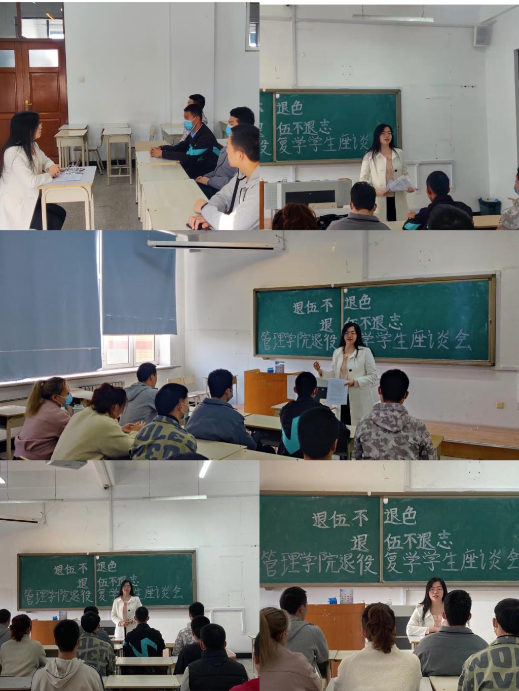 为深入了解、关心我院退役复学学生在生活、学习等方面的情况,发挥退役复学学生的积极作用,打造忠实可靠、追求卓越的先锋队伍。10月15日,管理学院在主楼W0415举办了“退伍不褪色,退伍不退志”管理学院退役复学学生座谈会,管理学院征兵工作负责人李丽娜老师参加会议并与学院退役复学学生开展了深入交流。