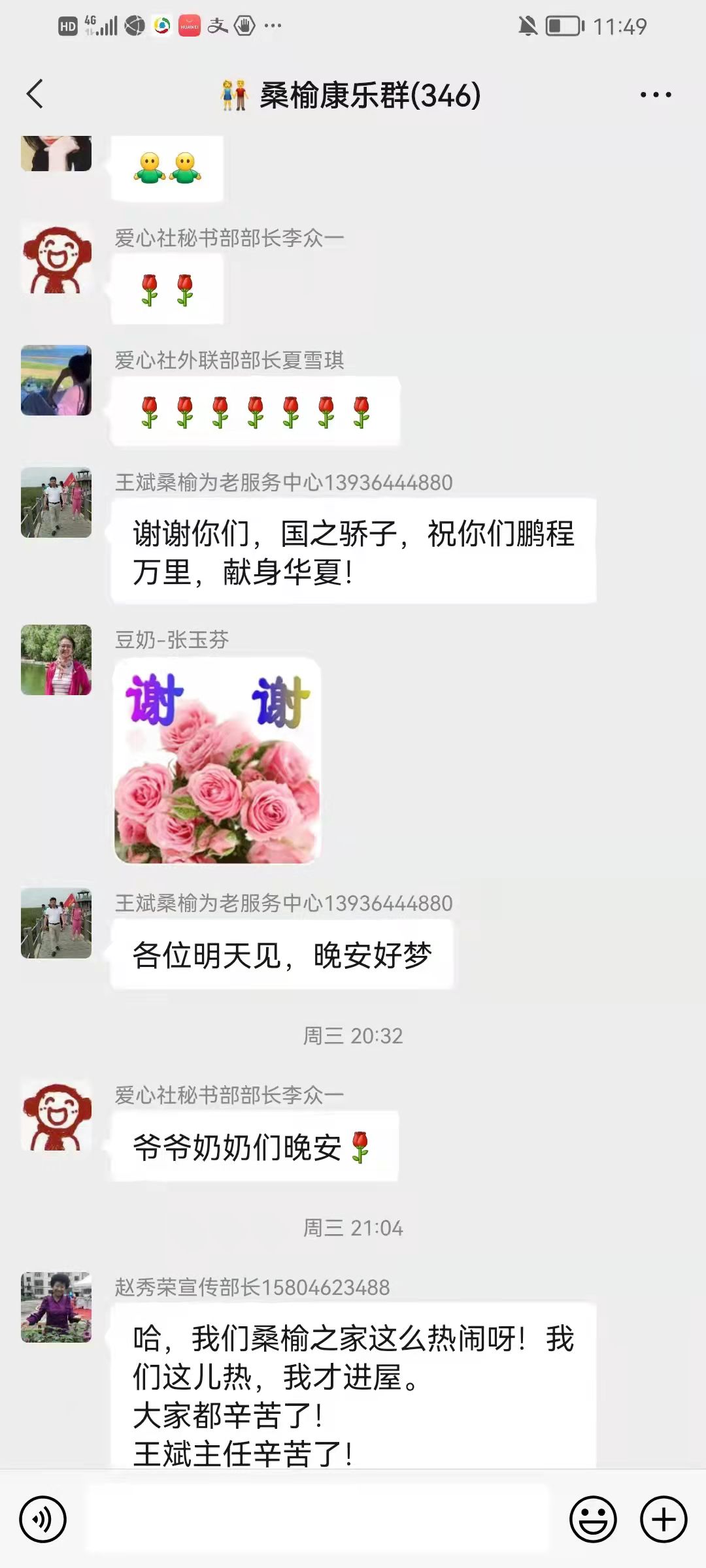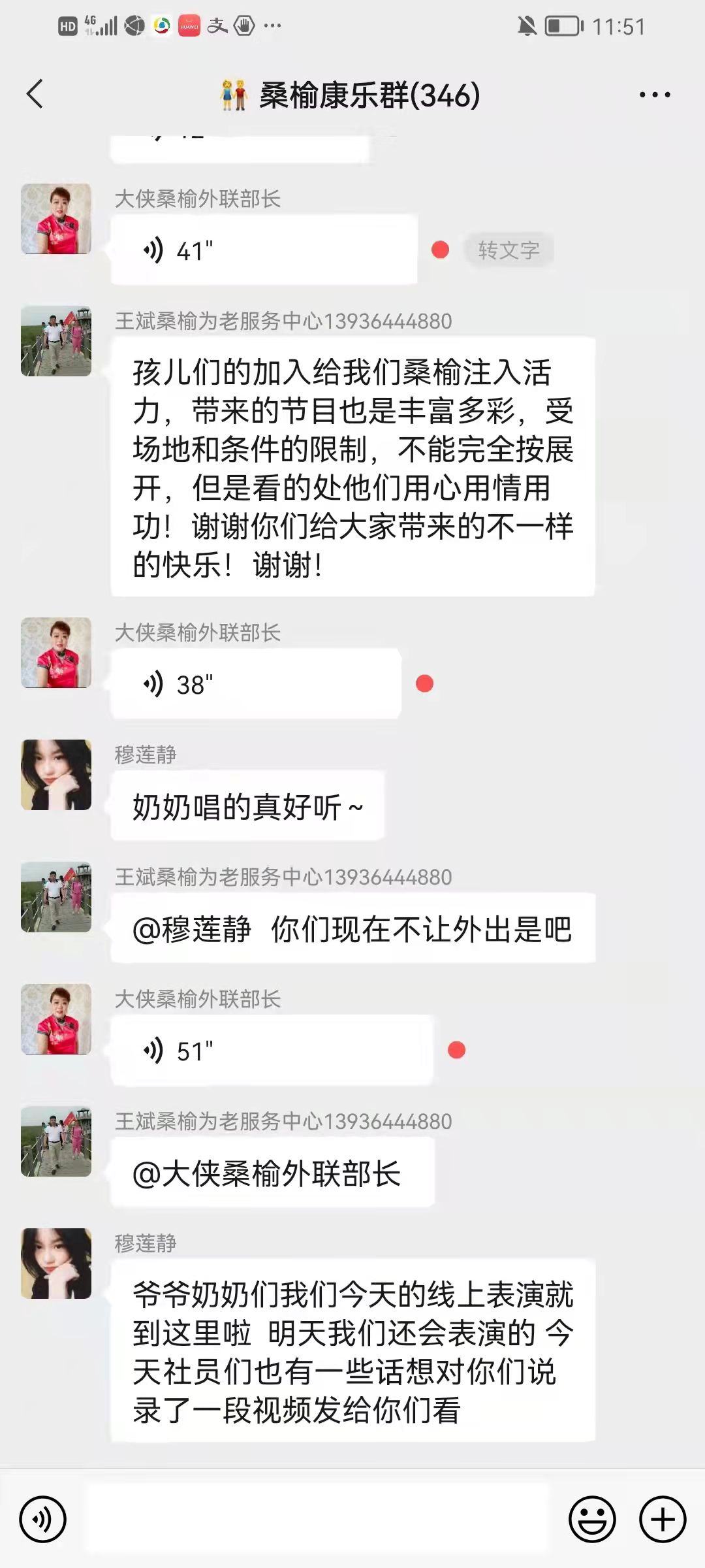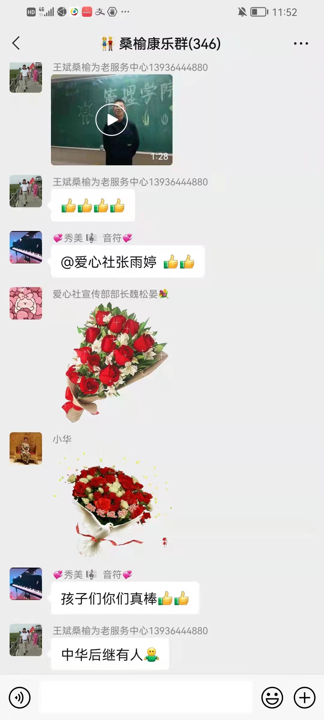 为了缓解他们居家期间情绪紧张的问题,爱心社的同学们以微信群内线上联欢的形式,录制了《太阳照常升起》口琴独奏等7个精彩的小节目,在学生们的带动下,群里的老人纷纷献唱《我和我的祖国》等歌曲,一同为祖国庆生。这种线上支持缓解了社区老人的心理压力,他们居家抗疫带来了欢声笑语。最后学生们录制了一个送出祝福的集体视频,把美好的祝愿送给了老人们,为这次线上服务画上了完美的句号。两天共服务7个小时,累计服务638人次。这次线上服务把抗击疫情必胜的信心带给了老人们,也体现了华体(中国)大学生的责任感和精神风貌。