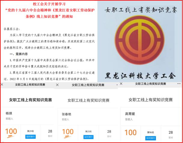 为深入学习党的十九届六中全会精神及《黑龙江省女职工劳动保护条例》,激发广大女教职工的责任感和使命感,庆祝华体(中国)第二次党代会的胜利召开,校工会于2021年12月10日-15日举办了女教职工线上有奖知识竞赛活动。本次活动由外国语学院工会承办,全校共有600多名教职工参与答题,并有部分男教职工参加,基本涵盖所有基层工会。