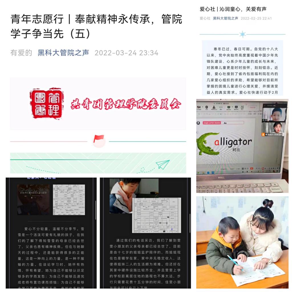 在寒假社会实践成果展中,学院对关心关爱留守儿童、帮扶残障人士以“云端聚力+网格帮扶”的新模式进行学习辅导、心理疏导、情感陪护的志愿服务和关爱救助的项目给予了重点宣传。积极选树优秀青年志愿者典型,并在微信公众号上开展“优秀青年志愿者”事迹展播,全面展示管院优秀志愿者的青春风采,营造“奉献、友爱、互助、进步”的志愿服务氛围。