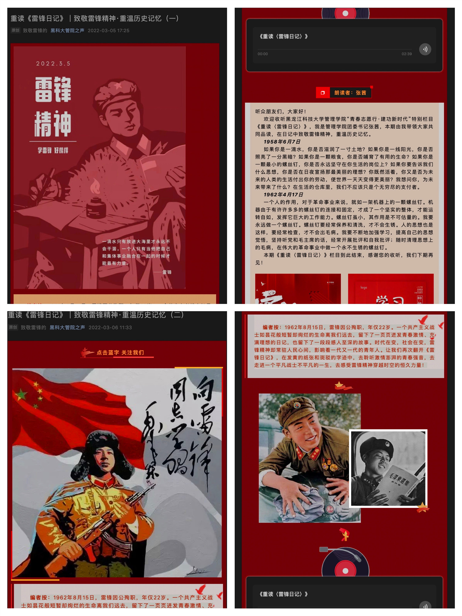 管理学院在“管院之声”微信公众号推出“青春志愿行·建功新时代”特别栏目《重读〈雷锋日记〉》。节目共有六期,分别由学院团委书记张茜带领各团学组织主要骨干录制而成,旨在通过品读日记,带领大家走近一个平凡战士不平凡的一生。此次活动,在全院范围内引起了广泛好评,掀起了新时代学习雷锋精神的热潮。