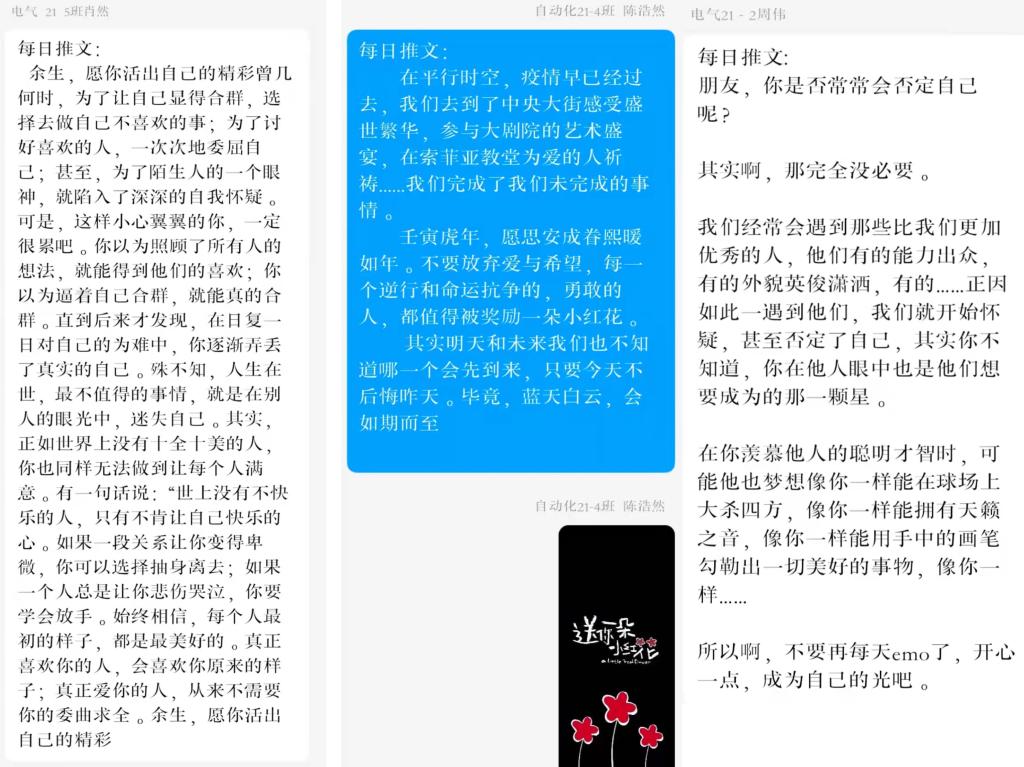 3月9日-25日,电气学院组织开展了“每日文案”活动,针对学生的心理健康问题,以文案的形式在心理联络员工作群予以解答,并通过鸡汤暖文培养学生乐观,向上的心理品质,促进学生人格的健康发展。“每日文案”活动致力于鼓励大学生走出阴霾,更加积极地去拥抱生活,促进学生形成健全的人格,促进学生身心全面和谐发展。