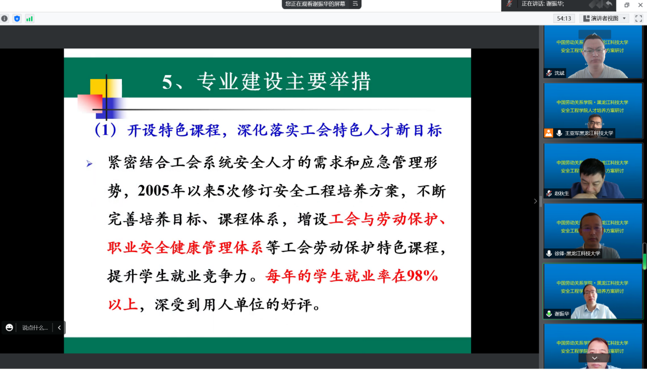 7月22日,调研组与中国劳动关系学院安全工程学院开展了线上研讨会,交流人才培养方案及教学改革经验。安全工程系主任谢振华介绍了安全工程专业的发展历程、专业特色、课程体系和专业建设主要措施,分享了在人才培养方案改革方面的经验和难点;应急技术与管理系主任安红昌,依托应急联盟,介绍了全国应急技术与管理专业人才培养现状,分享了本专业人才培养方案的制定过程、课程体系和对未来就业出口的思考;书记战帅介绍了劳育特色的学生第二课堂成绩单,将学生管理培养融入到专业培养中;院长赵秋生、副院长孙贵磊,分别从学院专业建设情况、人才培养特色、师资队伍建设等方面做了总结,并分享了办学经验。与会专家一致认为,要将国家战略需求、区域经济社会发展、学校办学定位和行业标准紧密结合,合理定位人才培养目标,要明确人才培养的行业特色、职业定位、素质能力需求,坚持专业特色,要在人才培养目标与毕业要求、毕业要求与课程体系的支撑关系上下功夫,深入实践“三全育人”“五育并举”,深化教育教学改革,努力形成高水平应用型人才培养体系。