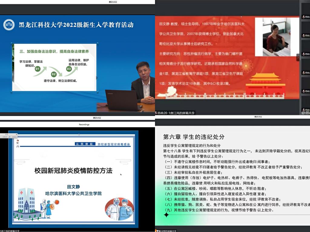 一是开展法制教育。组织观看《大学生法制教育》专题讲座、“同上一堂网络安全课”,增强2022级新生的法律意识和法制观念,关注网络信息安全,提高自我保护意识,做知法、懂法、守法的新时代青年。二是开展校规校纪教育。通过学习《华体官网网页版学生管理规定》,教育引导新生熟知学校各项管理制度以及相关政策法规,使新生自觉遵守校规校纪,提高文明自律意识,促进良好行为素养和文明行为习惯养成。三是开展疫情防控教育。组织观看《校园新冠肺炎疫情防控方法》专题讲座,帮助新生了解当前疫情形势与防控政策,培养学生防疫意识与大局观念,增强学生抗“疫”信心,筑牢校园疫情防控屏障。
