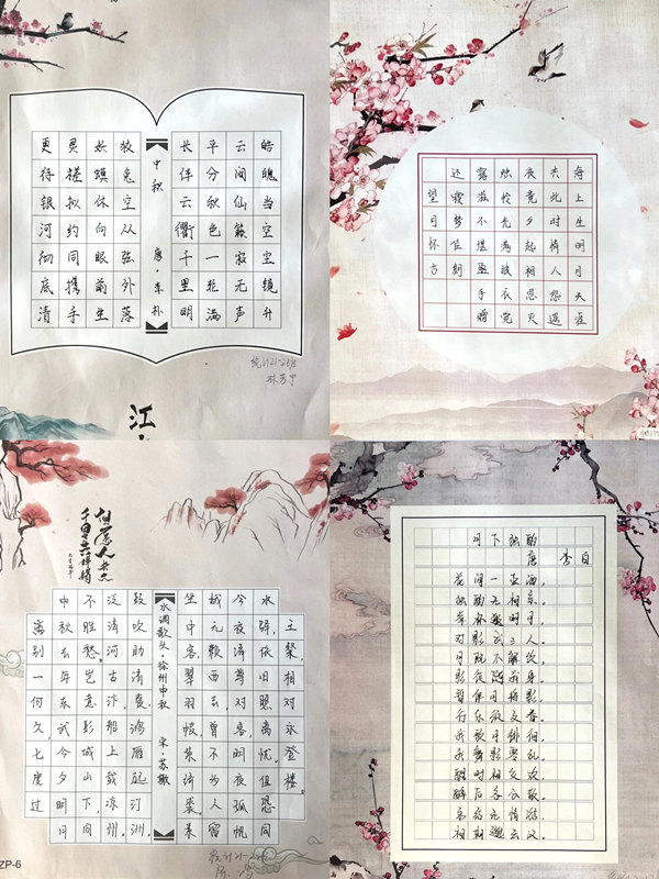 为丰富学生们的文化生活,进一步拉近他们与中国传统文化的距离,中秋佳节之际,通过“花好月圆,诗词之美”活动,以书画会友、以笔墨传情,用书法雅集的形式共庆中秋,书写团圆诗篇。学生们以中秋节传统习俗、中秋节诗词等为题材,运用画、软笔书法、硬笔书法等多种表现方式进行作品创作。学生的作品在版面设计、图案构思、色彩搭配、内容创意等方面各具特色,从不同的角度展现了他们积极向上的精神文明风貌,表达了他们对亲人的思念和对祖国的热爱。